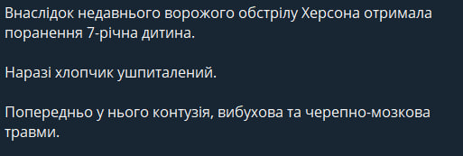 Внаслідок недавнього російського обстрілу Херсона постраждала дитина. Йдеться про 7-річного хлопчика.